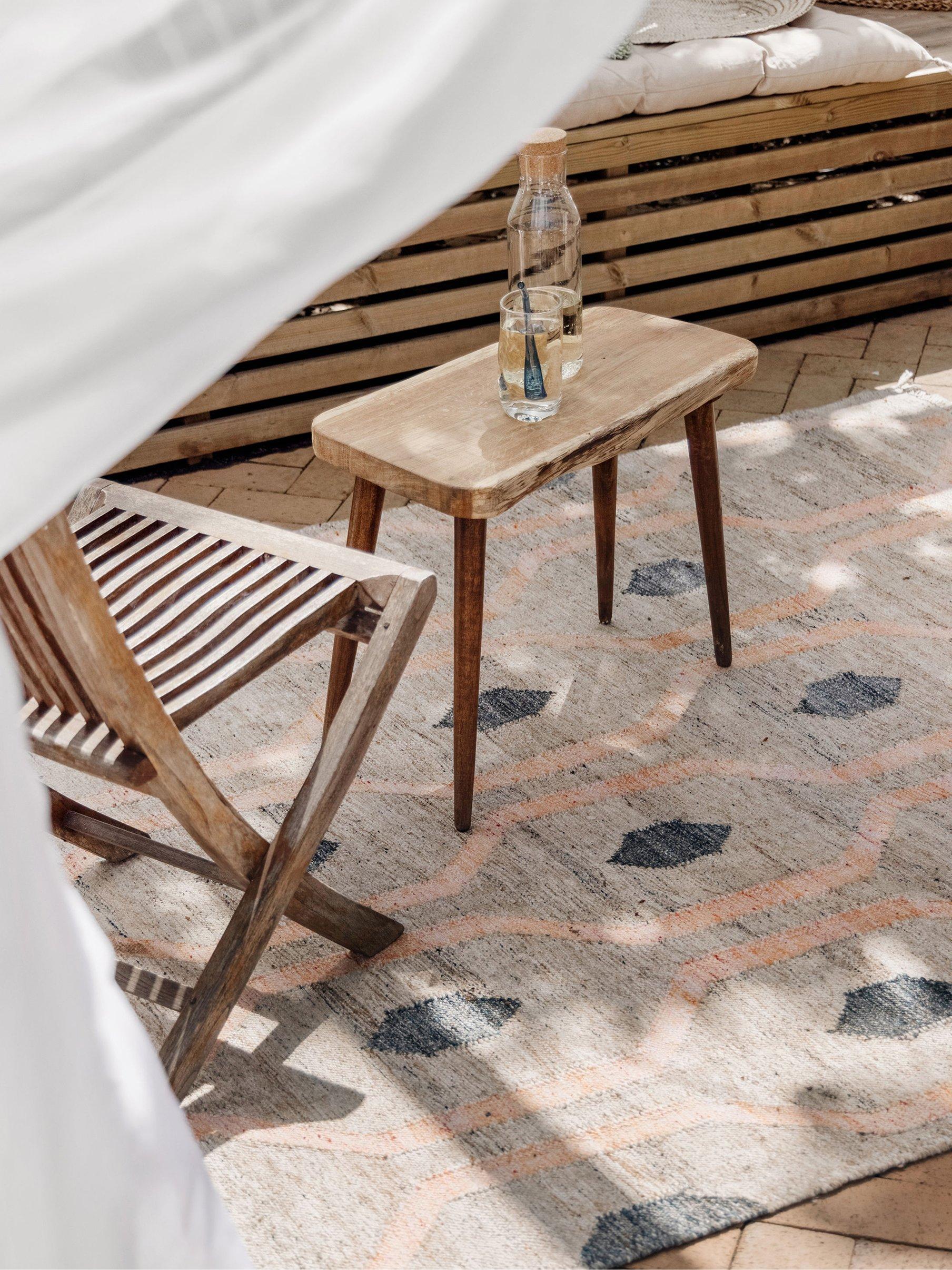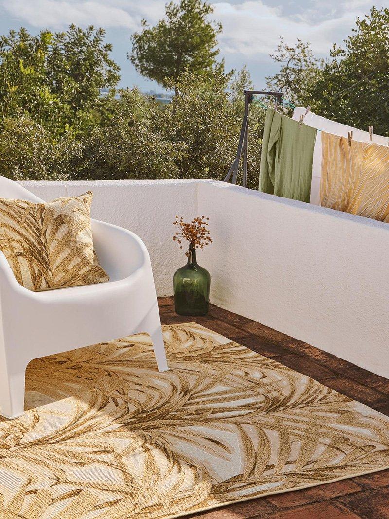 Since rain, sunlight, and dirt aren’t typically very rug-friendly, outdoor rugs tend to be designed to survive the harsh conditions that might occur on your balcony, patio or wood deck. To achieve this weather resistance, outdoor rugs are often made from synthetic materials (Polypropylen). As well as being durable and weatherproof, syntethic outdoor rugs are lightweight and rollable, making them easy to store away in the winter season.